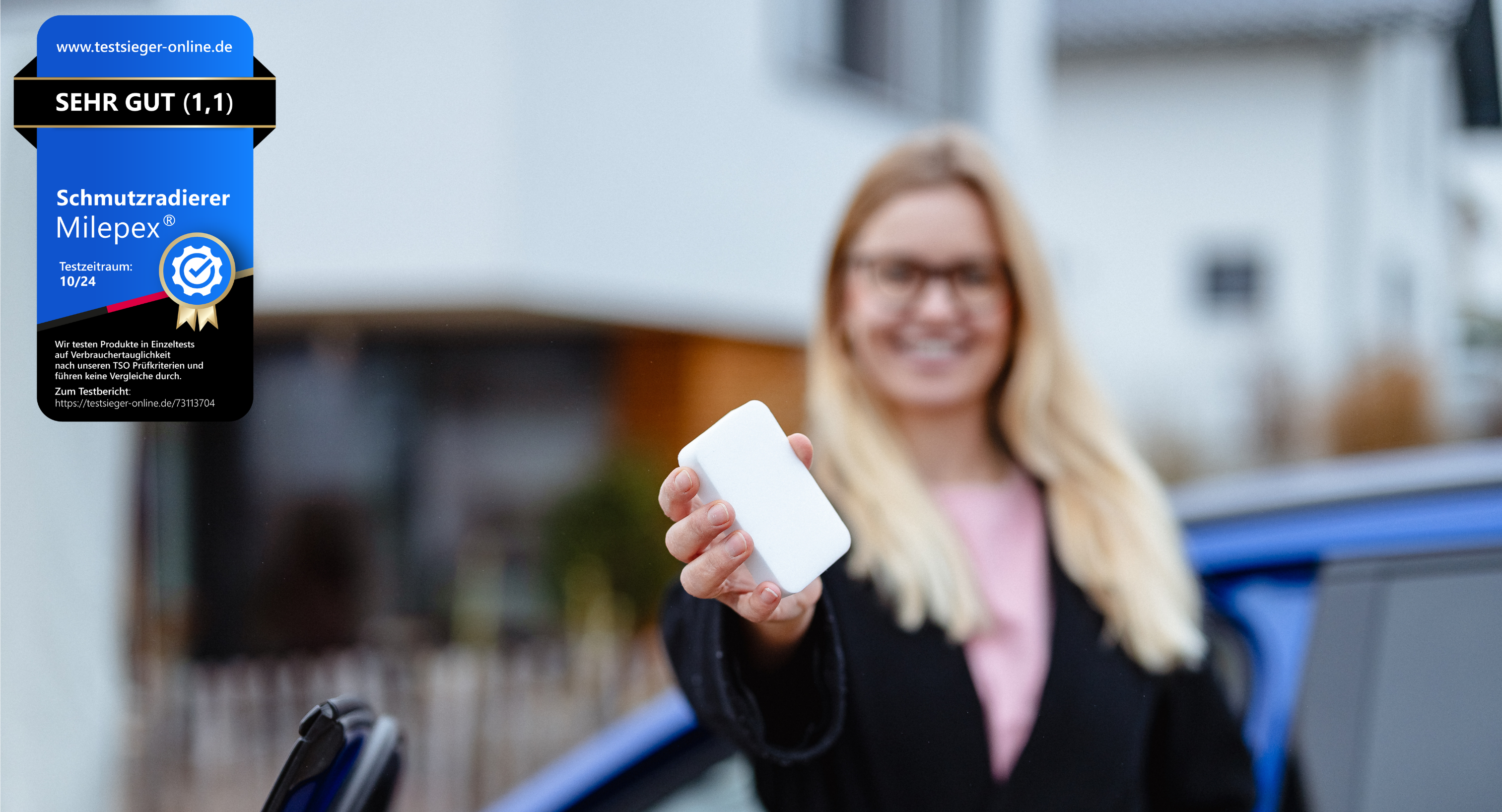 Unser Schmutzradierer wurde in einem unabhängigen Testverfahren geprüft und mit der Bestnote 1,1 bewertet – für Qualität, Effektivität und Handhabung.